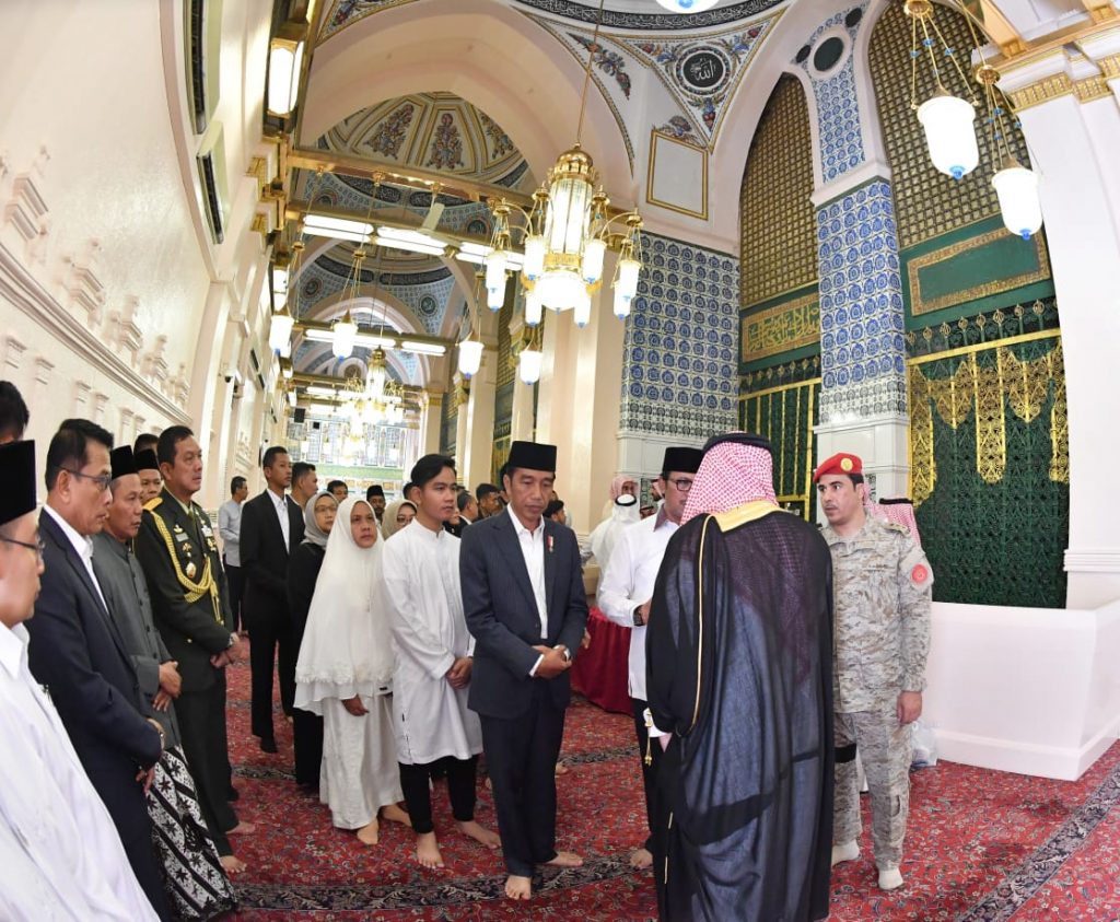 MADINAH, Setelah sebelumnya diberi kehormatan oleh pemerintah Kerajaan Arab Saudi masuk ke Kakbah Baitullah di Mekkah, Presiden Joko Widodo dan Ibu Negara Iriana Joko Widodo dan kedua putranya, berziarah ke Makam Rasulullah SAW di kota Madinah Al Munawwarah.