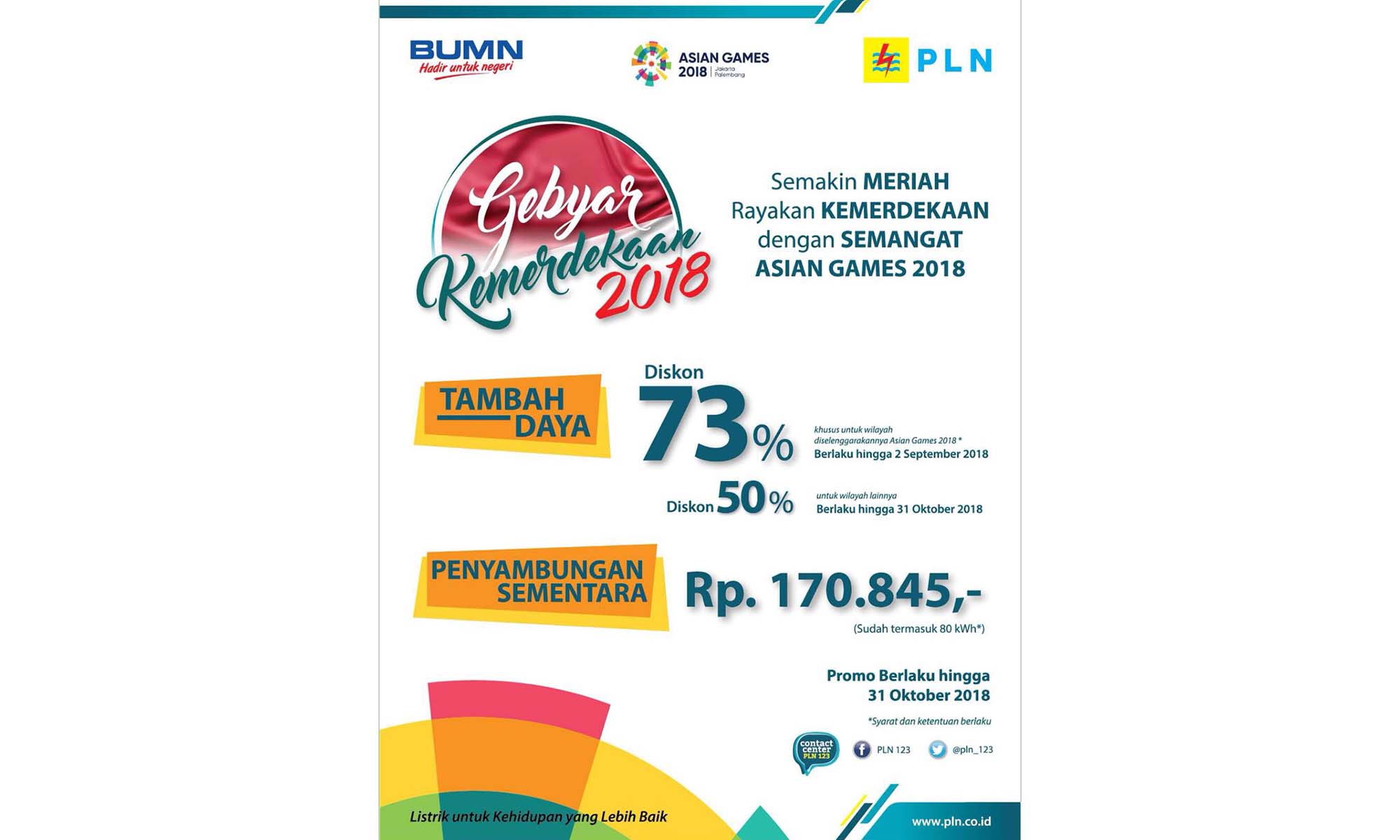 BANJARBARU, Dalam rangka perayaan Kemerdekaan Republik Indonesia ke-73 dan Asian Games 2018, PLN Wilayah Kalimantan Selatan dan Kalimantan Tengah (PLN Kalselteng) memberi kado istimewa dengan kembali menggelar Promo Gebyar Kemerdekaan 2018. Promo tersebut meliputi penambahan daya listrik hingga penyambungan sementara.