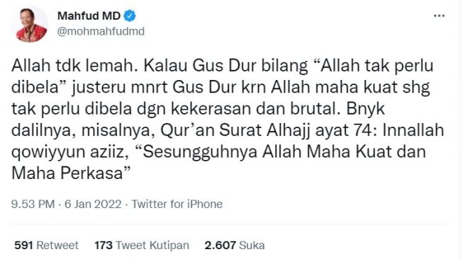 “Allah tidak lemah. Kalau Gus Dur bilang “Allah tak perlu dibela” justeru mnrt Gus Dur krn Allah maha kuat shg tak perlu dibela dgn kekerasan dan brutal. Bnyk dalilnya, misalnya, Qur’an Surat Alhajj ayat 74: Innallah qowiyyun aziiz, “Sesungguhnya Allah Maha Kuat dan Maha Perkasa,” tulis Mahfud MD yang dikutip dari twitter pribadinya Jumat (7/1/2022).