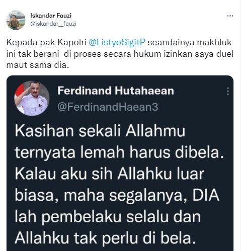 “Kasihan sekali Allahmu ternyata lemah harus dibela. Kalau aku sih Allahku luar biasa, maha segalanya, DIA lah pembelaku selalu dan Allahku tak perlu di bela,” cuit Ferdinand melalui akun twitternya.