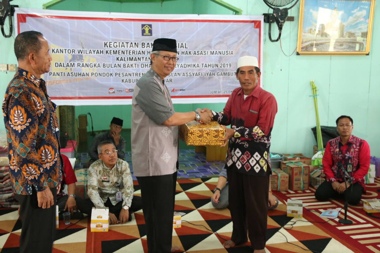 MARTAPURA, Dalam rangka memperingati bulan Bhakti Dharmas Karyadhika, Kementerian Hukum dan Hak Asasi Manusia (Kemenkumham) Kalimantan Selatan menggelar bakti sosial di Panti Asuhan Pondok Pesantren (Ponpes) Ibnu Ruslan Assyafi’iyah, Jumat (25/10).