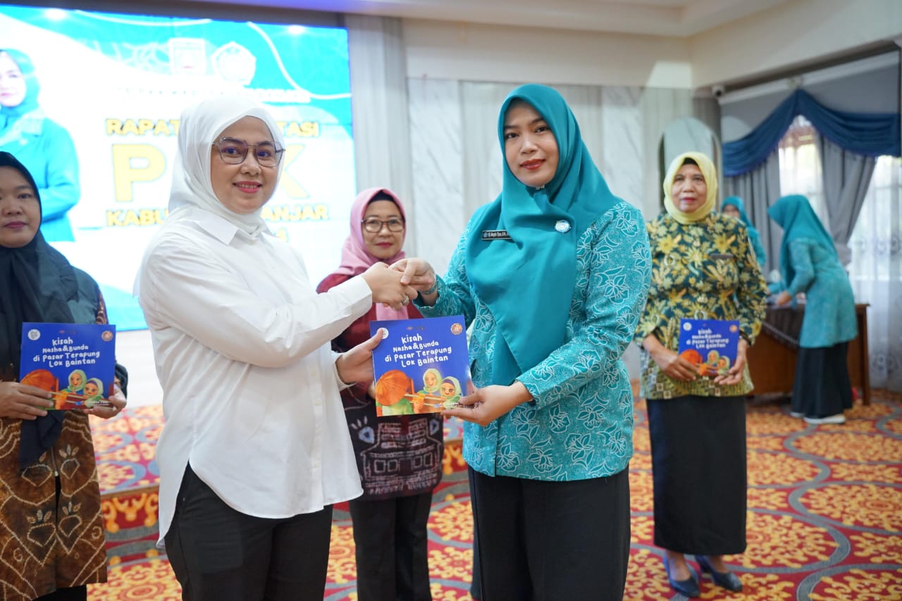 Dalam kesempatan tersebut diserahkan buku Kisah Nasha dan Bunda di Pasar Terapung Lok Baintan oleh Ketua TP PKK Banjar kepada para istri Forkopimda dan pengurus PKK Kabupaten Banjar. (Kanalkalimantan.com/dkispbanjar/kk)