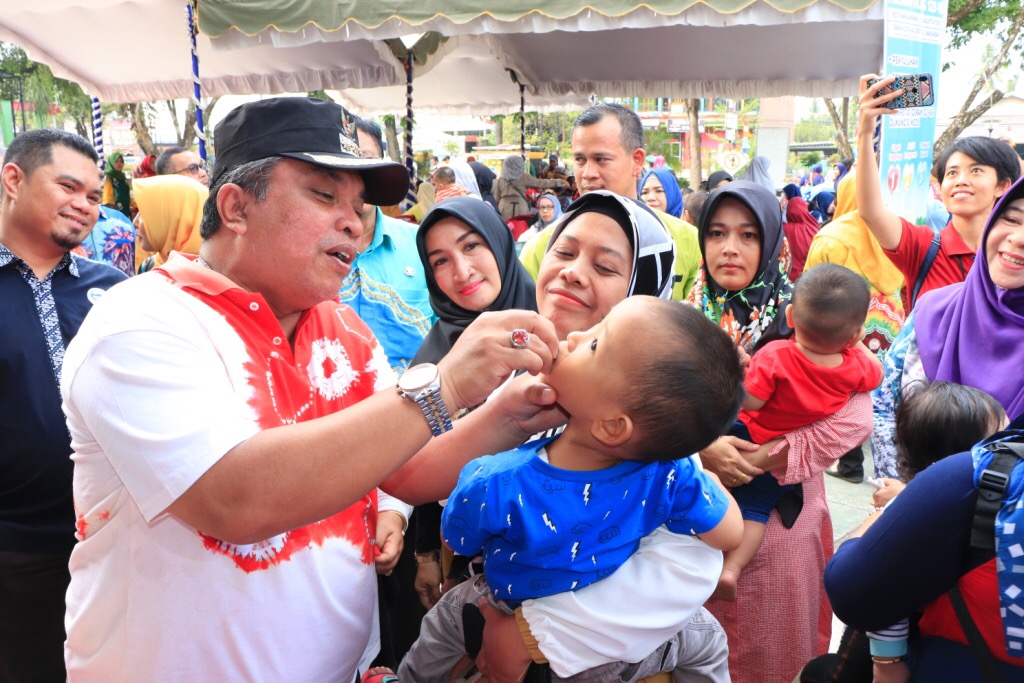 H Nadjmi Adhani dan Ketua TP PKK Kota Banjarbaru Hj Ririen Nadjmi Adhani memberikan vitamin A kepada anak-anak balita.