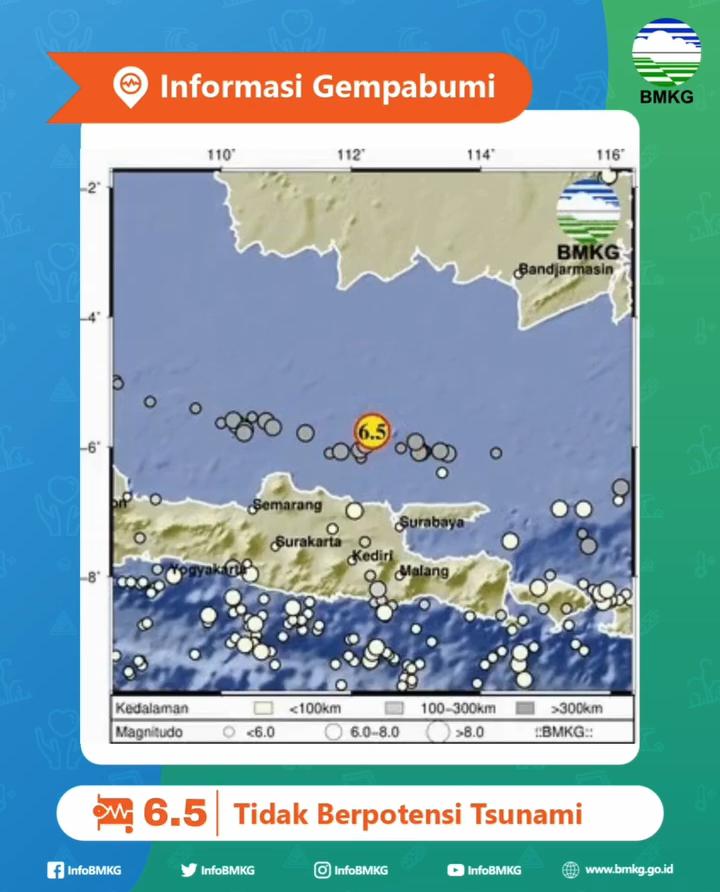 Gempa berkekuatan 6,5 skala richter itu dilaporkan terjadi di Tuban, Jawa Timur pada pukul 15.52 WIB.