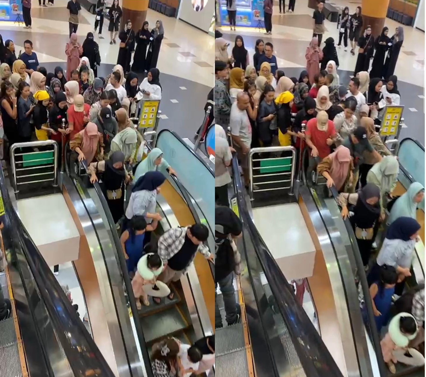 Dari kiriman video warga, terlihat pengunjung Duta Mall orangtua dan anak-anak yang berada di lantai atas berdesakan turun menggunakan eskalator.