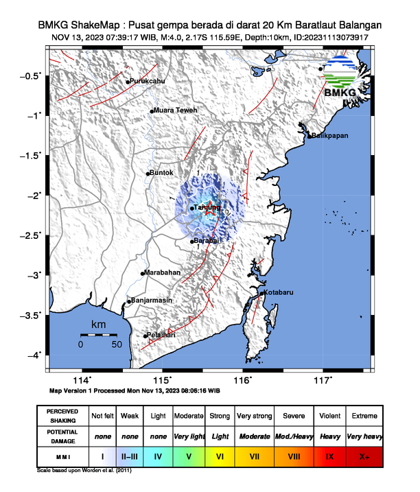 “Gempa dirasakan Mag:4.0, 13-Nov-23 07:39:17 WIB, Lok:2.17 LS, 115.59 BT (Pusat gempa berada di darat 20 Km Barat Laut Balangan)” berikut pengumuman dari laman resmi BMKG, Senin (12/11/2023) pagi.