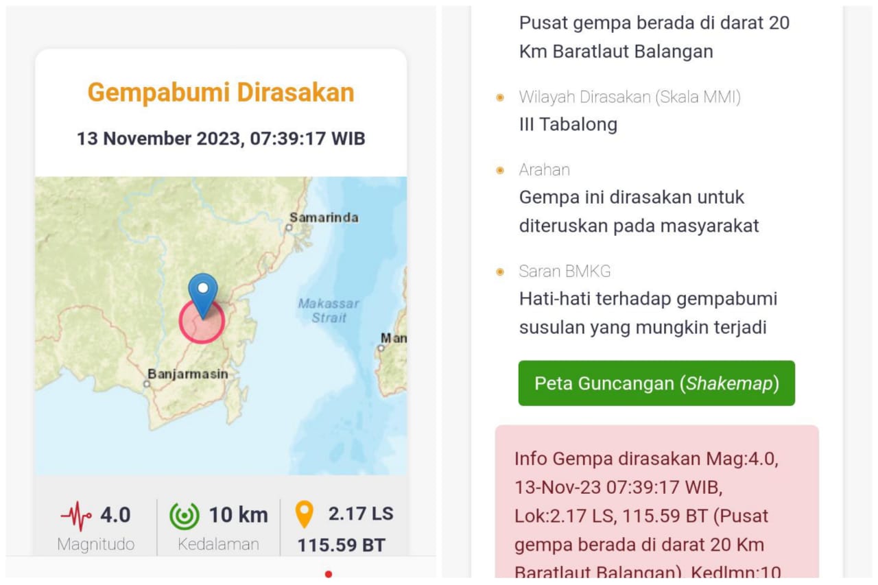 “Gempa dirasakan Mag:4.0, 13-Nov-23 07:39:17 WIB, Lok:2.17 LS, 115.59 BT (Pusat gempa berada di darat 20 Km Barat Laut Balangan)” berikut pengumuman dari laman resmi BMKG, Senin (12/11/2023) pagi.