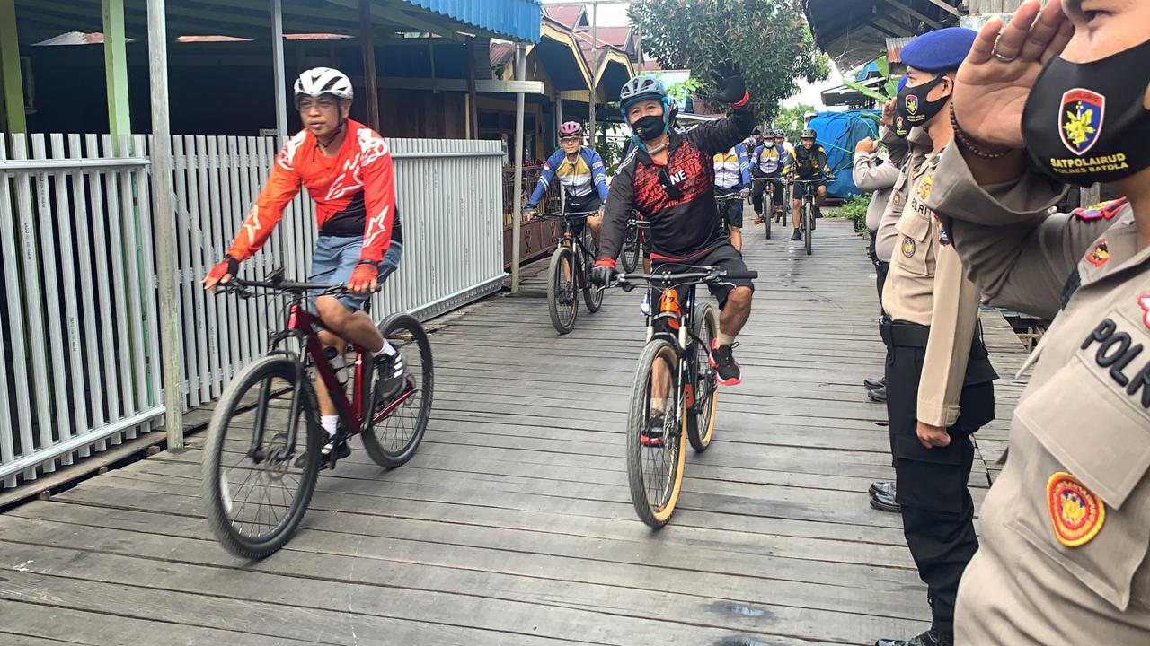KANALKALIMANTAN.COM, BANJARMASIN – Gowes bareng dilakukan Kapolda Kalsel Irjen Pol Dr Nico Afinta SIK SH MH bersama Kapolres Batola AKBP Lalu Moh Syahir Arif SIK SH MM, Sabtu (1/8/2020). Kawasan yang dilalui mulai dari Kayu Tangi, Anjir Muara hingga pelabuhan ferry di desa Jelapat, Kecamatan Tamban, Kabupaten Batola.