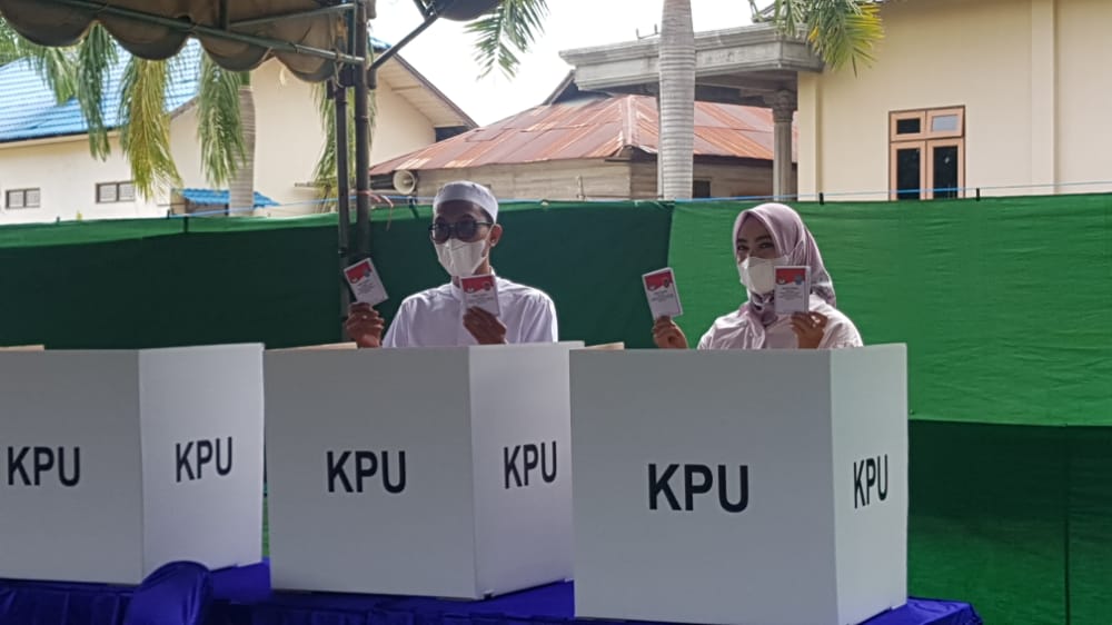 KANALKALIMANTAN.COM, MARTAPURA – Mengenakan pakaian warna putih, H Saidi Mansyur bersama istri, Hj Nur Gita Tyas mencoblos di TPS 01, Desa Madurejo, Kecamatan Sambungmakmur, Rabu (9/13/2020).