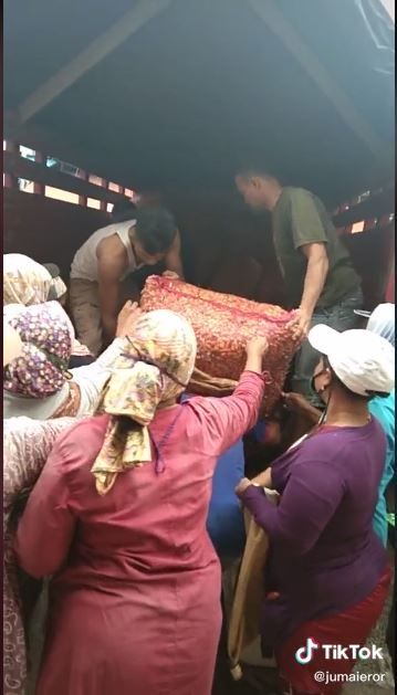 Dalam video tersebut, tampak beberapa pria hendak menurunkan cabai dari truk. Cabai tersebut berada di dalam karung jaring.