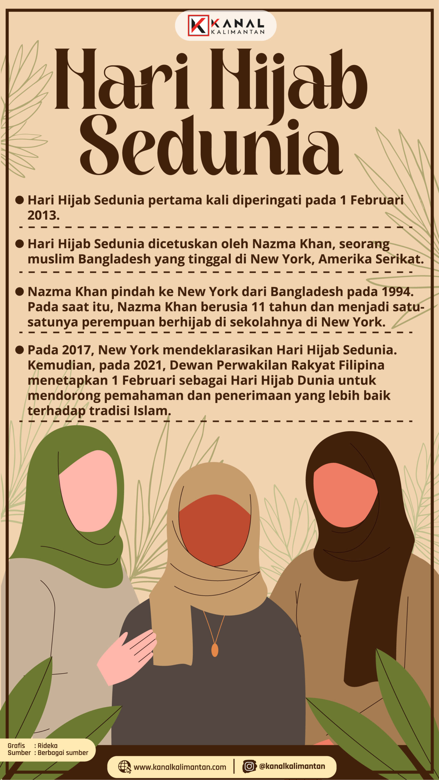 KANALKALIMANTAN.COM – Pada tanggal 1 Februari setiap tahun diperingati Hari Hijab Sedunia. Hijab merupakan penutup kepala yang dipakai oleh wanita muslimah.
