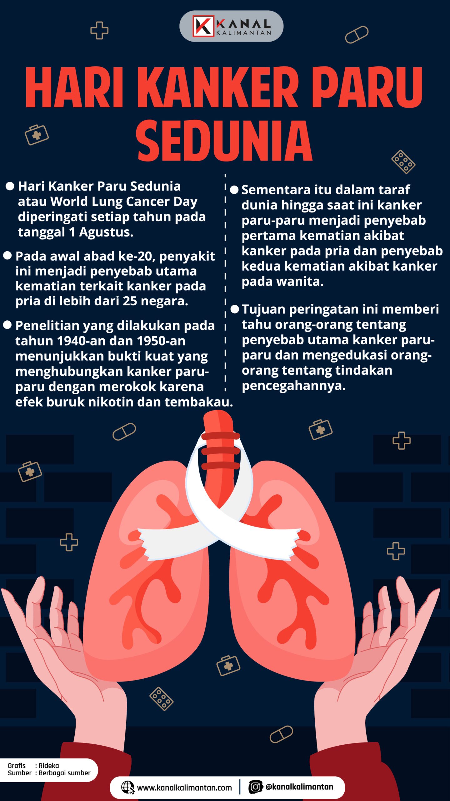 KANALKALIMANTAN.COM – Setiap tanggal 1 Agustus, dunia memperingati Hari Kanker Paru Sedunia untuk meningkatkan kesadaran masyarakat tentang bahaya penyakit kanker paru-paru.