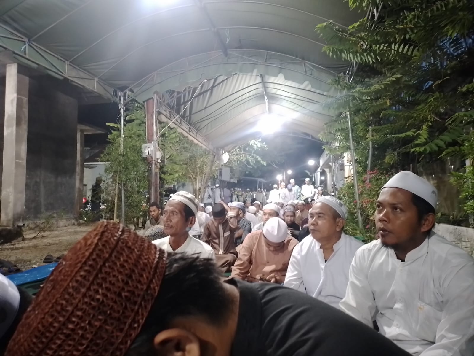 Jemaah haul memadati sekitar kubur yang berada di halaman rumah. Jemaah yang ada di jalan disediakan teh panas, kopi manis, dan kopi susu. Guru Qori –biasa disapa- berpulang ke Rahmatullah pada tahun 2016, di Bangil, Pasuruan, Jawa Timur, saat berkunjung ke sana. (Kanalkalimantan.com/ahmad mursyidi)