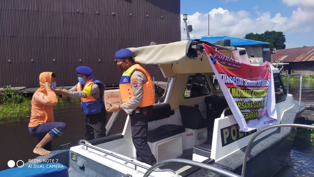 Pelaksanaan sosialisasi dan pemberian sembako oleh Kasat Polair Polres HSU Iptu Ashari bersama Briptu Beben A Hidayat selaku Bhabinkamtibmas Perairan Sat Polair Polres HSU door to door sistem, serta membagikan masker kepada warga desa.