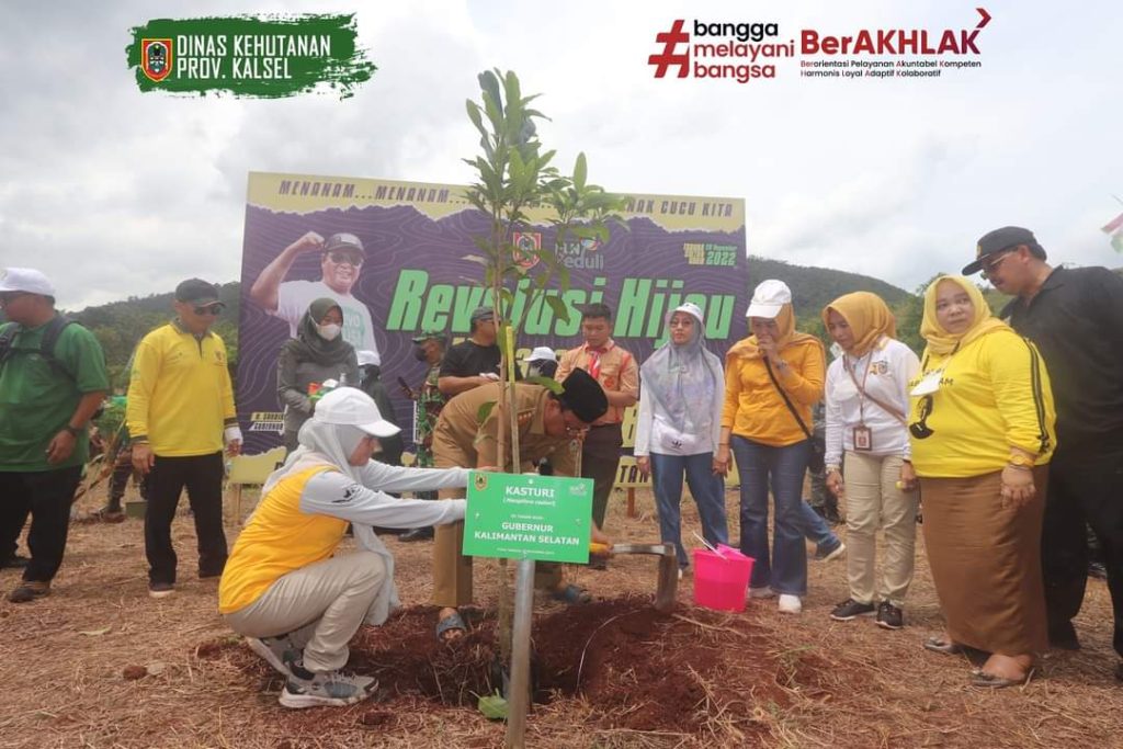 Disisi lain, Kepala Dinas Kehutanan Prov Kalsel Hj.Fathimatuzzahra dalam laporannya mengatakan penanaman hari ini terlaksana seluas 4 hektare dengan 4000 bibit tanaman, meliputi 1000 batang bibit mahoni dan 3000 batang bibit buah-buahan lokal dan langka khas Kalimantan, antara lain Bangkinang, Keledang, Bundar, Ginalum, Jambu Agung, Kalangkala, Kapul, Kasturi, Kuini, Asam Kandis, Manggis Hutan, Ramania, Rambai, dll.