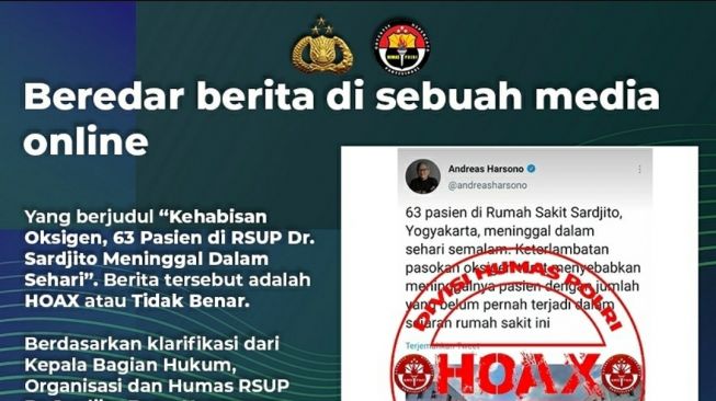 Adapun informasi yang distempel hoaks oleh Polri terkait pemberitaan 63 pasien meninggal dunia di Rumah Sakit Umum Pusat (RSUP) DR Sardjito Yogyakarta, akibat kelangkaan oksigen.