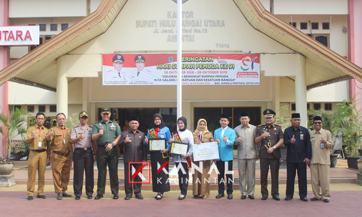 Selain pembacaan ikrar sumpah pemuda, di penghujung apel dilaksanakan penyerahan piagam penghargaan peserta Kapal Pemuda Nusantara (KPN) wakil Kalsel dari Kabupaten Hulu Sungai Utara kepada Norzakiah.
