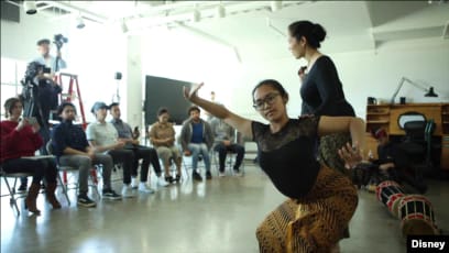 Konsultan budaya Raya, Emiko Susilo, beserta putrinya, Dewa Ayu Larassanti, menunjukkan gerakan tarian Bali di Studio Animasi Walt Disney di Burbank, California.