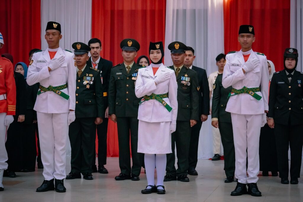 Dalam suasana khidmat, para Paskibraka berbaris rapi dengan penuh semangat dan kedisiplinan. Mereka mengenakan seragam putih merah, yang mencerminkan semangat patriotisme dan nasionalisme.