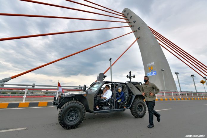 KANALKALIMANTAN.COM, BANJARMASIN– Presiden Joko Widodo (Jokowi) baru saja meresmikan Jembatan Sei Alalak sepanjang 850 meter dibangun dengan konstruksi teknologi tinggi serta tahan gempa. Berbeda dengan kunjungan ke Kalsel sebelumnya, kali ini Jokowi mengendarai kendaraan tempur milik Paspampres.
