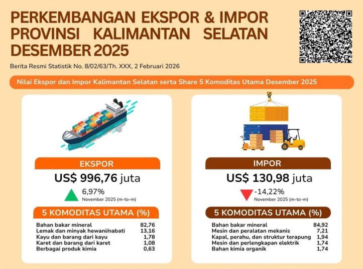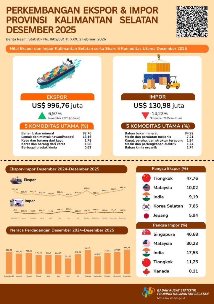 KANALKALIMANTAN.COM, BANJARBARU – Badan Pusat Statistik (BPS) Kalimantan Selatan (Kalsel) merilis ekspor barang asal Kalsel Desember 2025 mencapai US$996,76 juta. Angka itu naik 6,97 persen dibanding nilai ekspor pada November 2025 yakni US$931,79 juta.