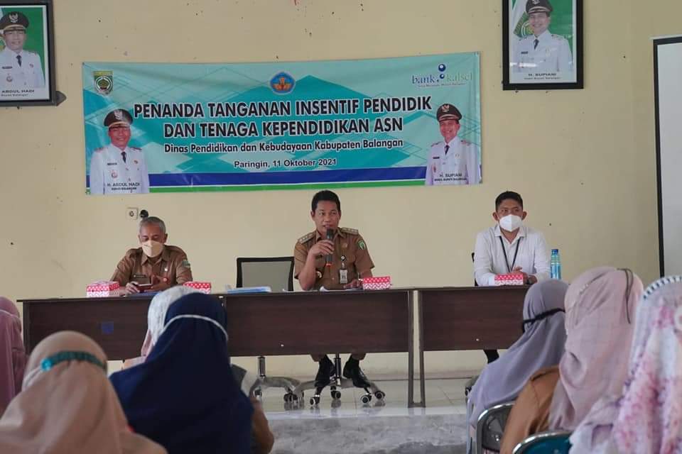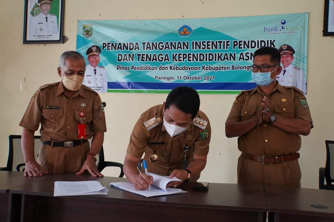 KANALKALIMANTAN, PARINGIN – Bupati Balangan H Abdul Hadi melakukan penandatanganan penyaluran kenaikkan dana insentif bagi tenaga kependidikan ASN, di aula Dinas Pendidikan dan Kebudayaan Kabupaten Balangan, Senin (11/10/2021).