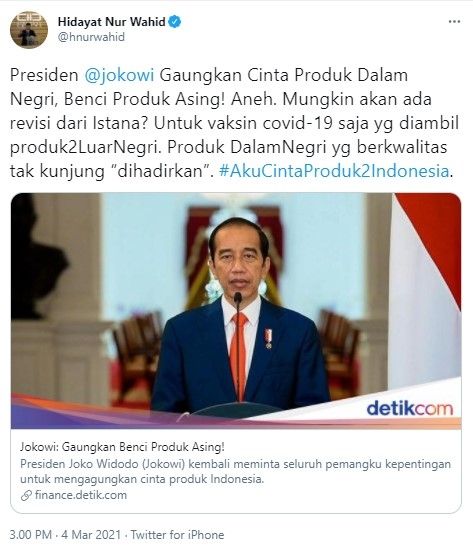HNW kritik Jokowi gaungkan benci produk asing (Twitter/hnurwahid)