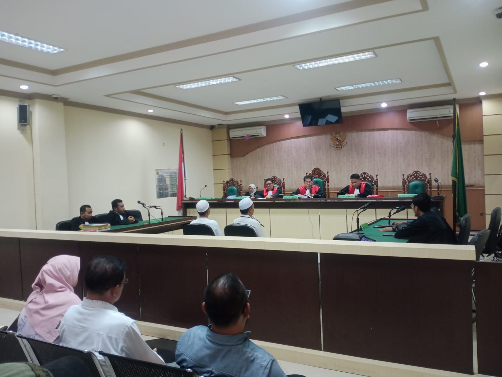 Terdakwa Joni Setiawan dan Aulia Rachman pada aat persidangan kompak mengenakan baju dan peci berwarna putih. Keduanya sempat menjawab pertanyaan hakim terkait kondisi kesehatan saat persidangan.“Sehat Alhamdulillah,” ucap kedua terdakwa.