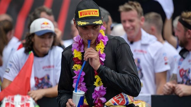 Rider Yamaha, Toprak Razgatlioglu menyedot minuman berenergi usai memastikan gelar juara dunia World Superbike (WSBK) 2021 di Sirkuit Mandalika, Lombok Tengah, NTB, Minggu (21/11/2021). Foto: BAY ISMOYO / AFP