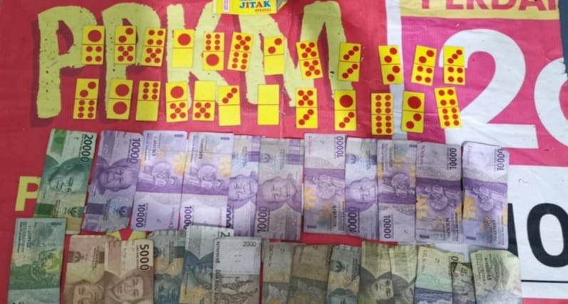 Dari tangan para pelaku, diamankan sejumlah barang bukti, diantaranya kartu domino, alas duduk dari spanduk, serta uang tunai sejumlah Rp 167 ribu.