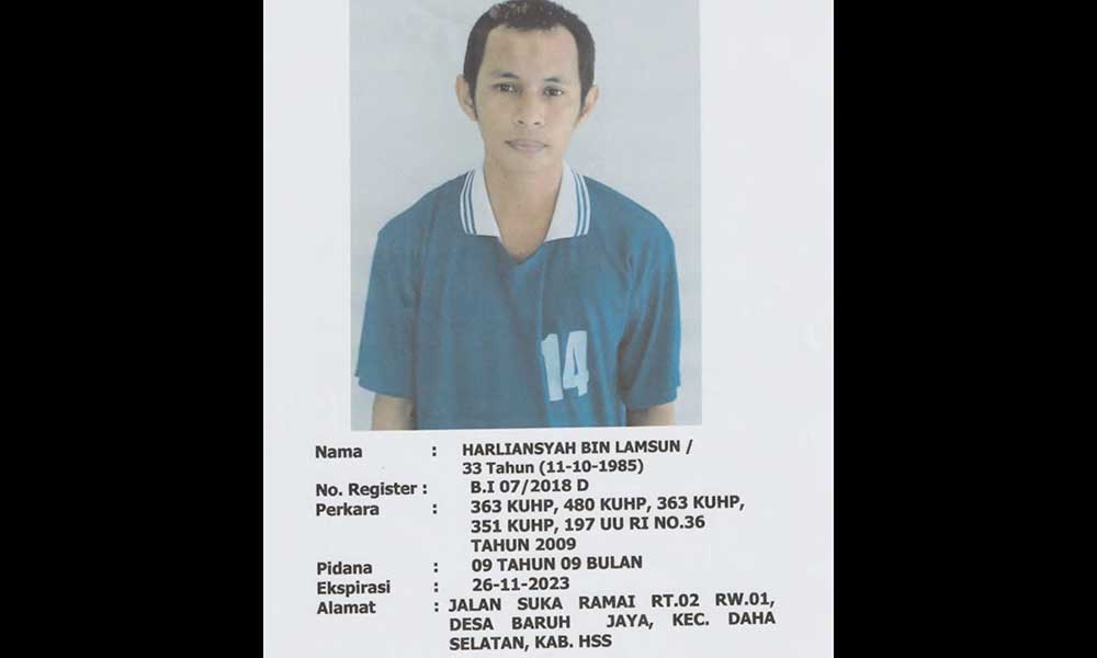 “Dengan sigap Tim Pencarian lapas Kelas III Tanjung beserta Tim dari Polsek Daha Selatan langsung melakukan penyergapan dan berhasil memborgol tersangka,” pungkas Kadivpas Kemenkumham Kalsel.