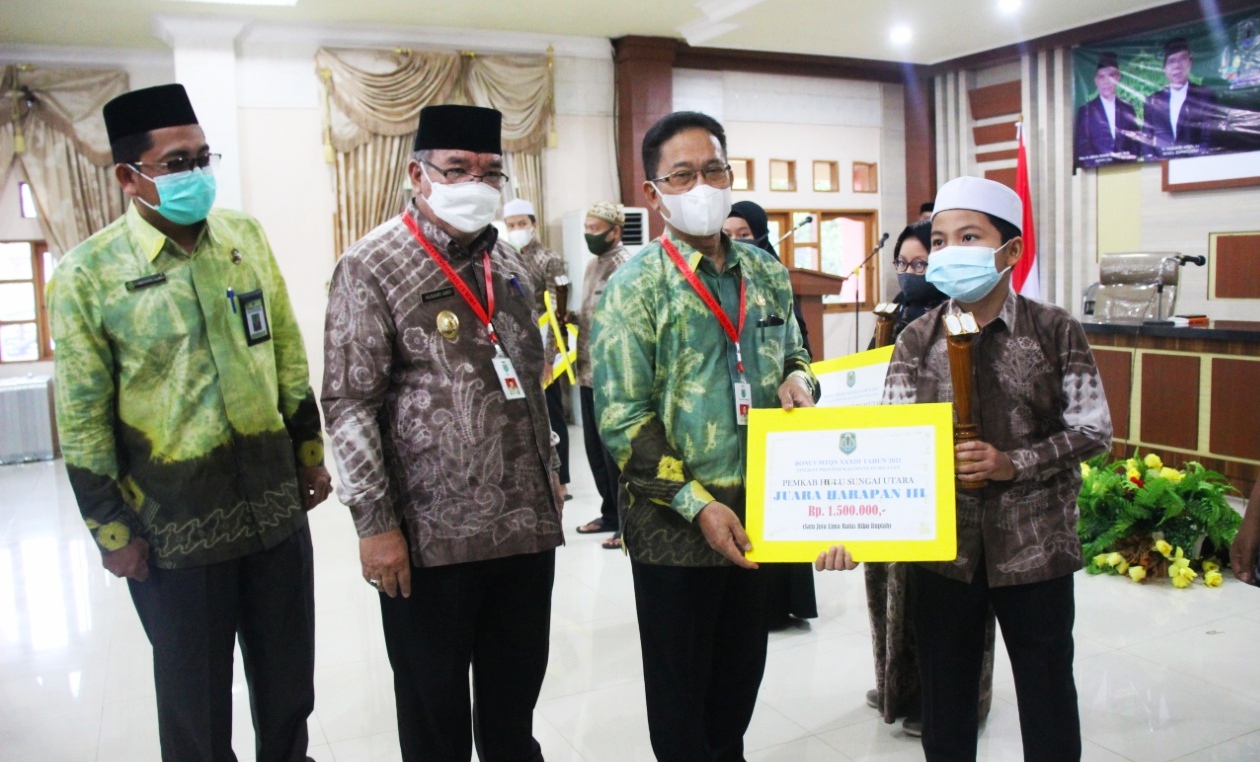 Peraih juara MTQ Nasional XXXIII menerima bonus yang diserahkan langsung Wakil Bupati HSU H Husairi Abdi Lc, Kamis (6/5/2021).