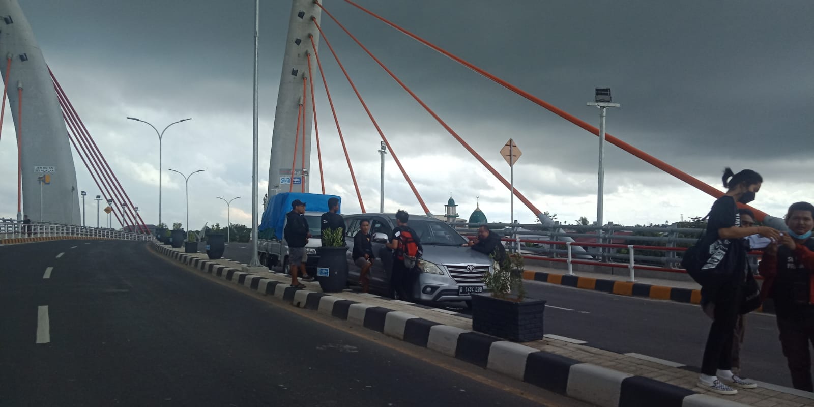Dari pantauan Kanalkalimantan.com hari kedua penutupan jalur sisi kiri jembatan Selasa (19/10/2021) siang, para pekerja dan pihak BBPJN (Balai Besar Pelaksana Jalan Nasional) Wilayah XI Banjarmasin mulai melakukan pengerjaan persiapan untuk peresmian jembatan lengkung pertama di Indonesia tersebut.