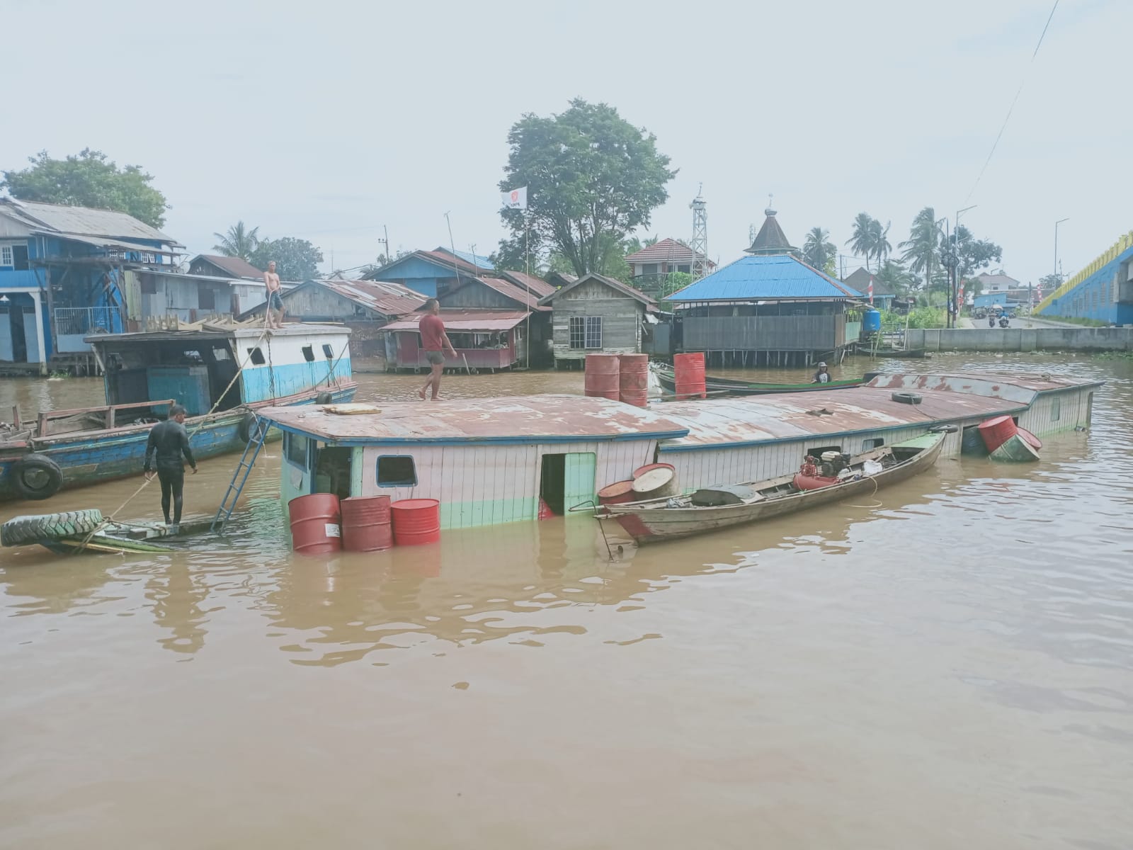 Terlihat beberapa drum kosong diikatkan di sisi-sisi badan kapal supaya kapal tersebut tidak tenggelam sepenuhnya.