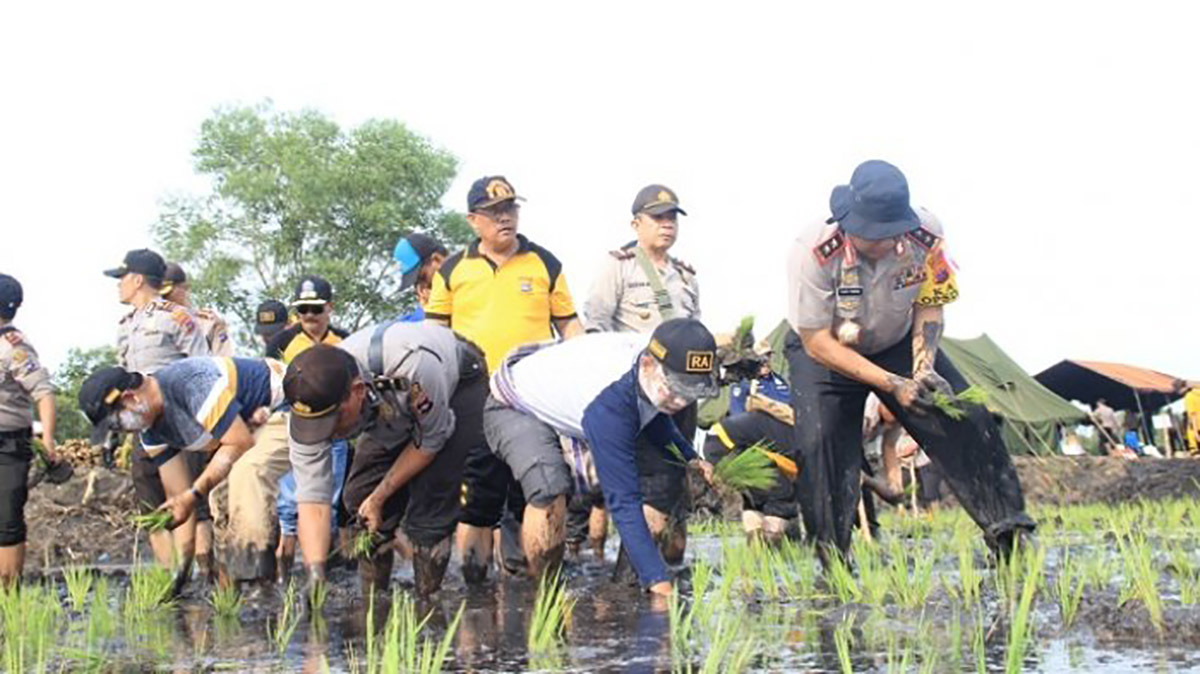 BATOLA, Tak hanya melakukan pengamanan, jajaran Polda Kalsel juga ikut melakukan penanaman padi di lokasi Hari Pangan Sedunia (HPS), di Desa Jejangkit, Batola, Selasa (16/10) . Kapolda Irjen Yazid Fanani memimpin anggotanya turun ke sawah untuk menanam padi.