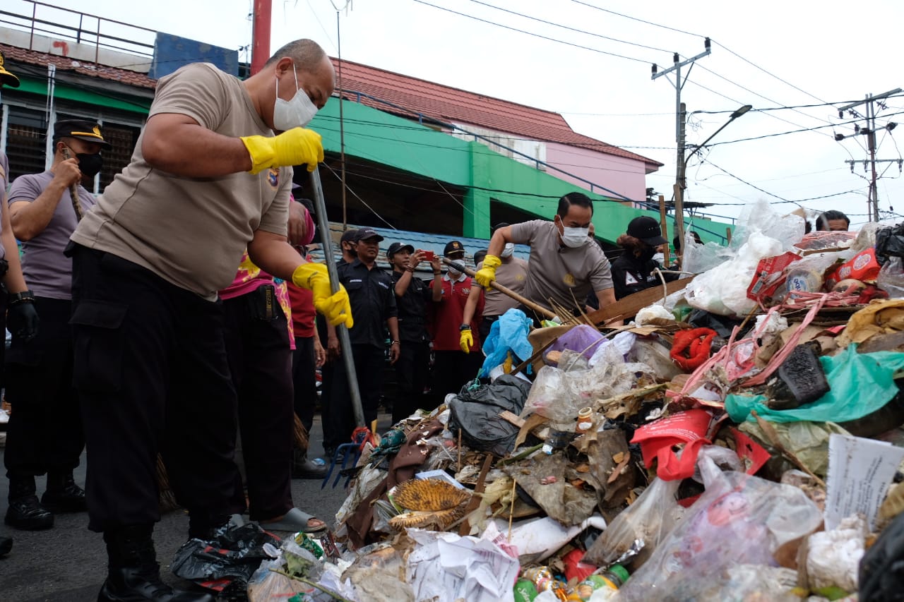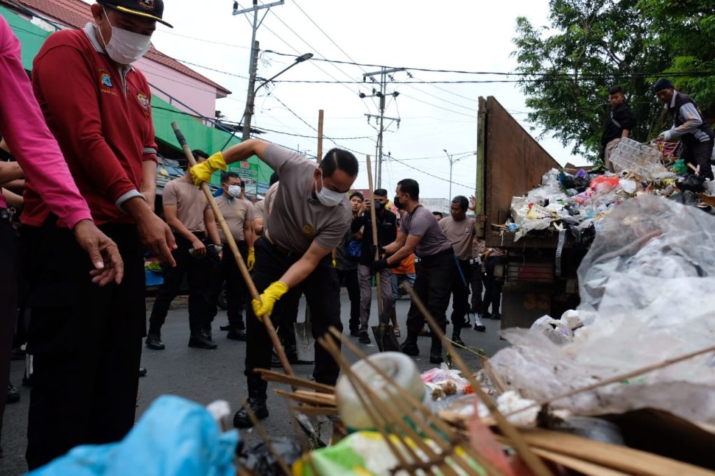 Kapolda Kalsel Irjen Pol Andi Rian Djajadi bersama jajaran dan warga membersihkan sampah di pasar Sudimampir Banjarmasin. Foto: rizki