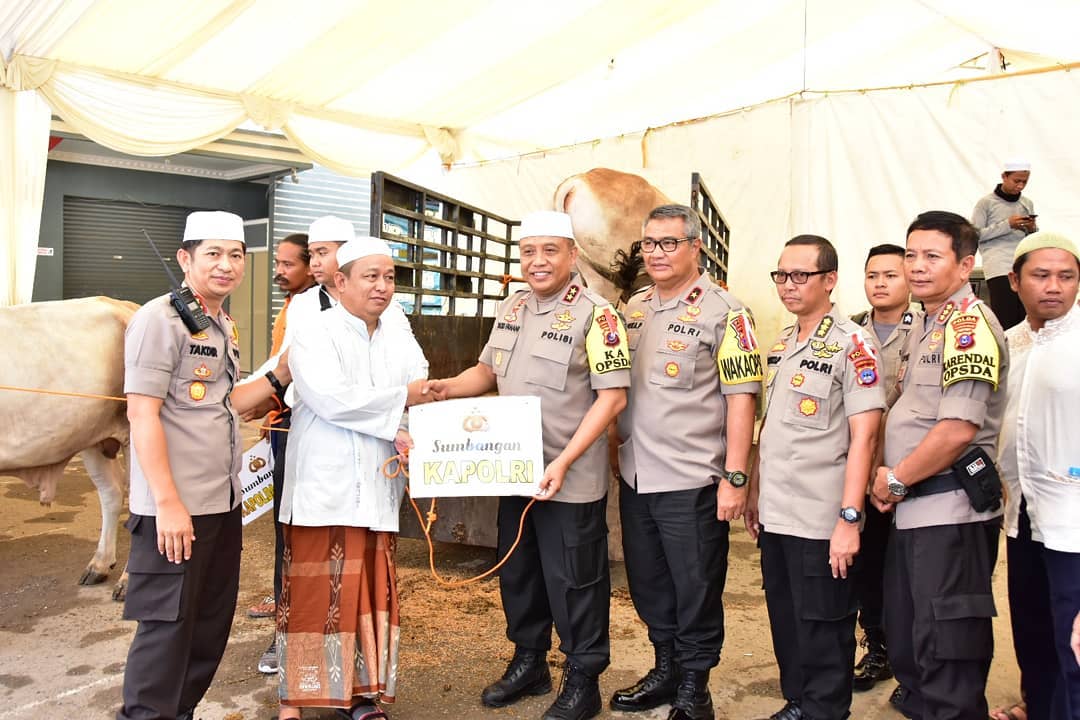 MARAPURA, Kapolda Kalsel Irjen Yazid Fanani menyerahkan tiga sapi jenis limosin secara simbolis ke panitia Haul ke-14 Guru Sekumpul, yang diterimakan KH Sa’dudin selaku Imam Musholla Ar Raudah, Jumat (8/3) siang. Ketiga sapi tersebut masing-masing sumbangan Kapolri Jenderal M Tito Karnavian, Kapolda Irjen Yazid, dan Wakapolda Kalsel Brigjen Aneka Pristafuddin.
