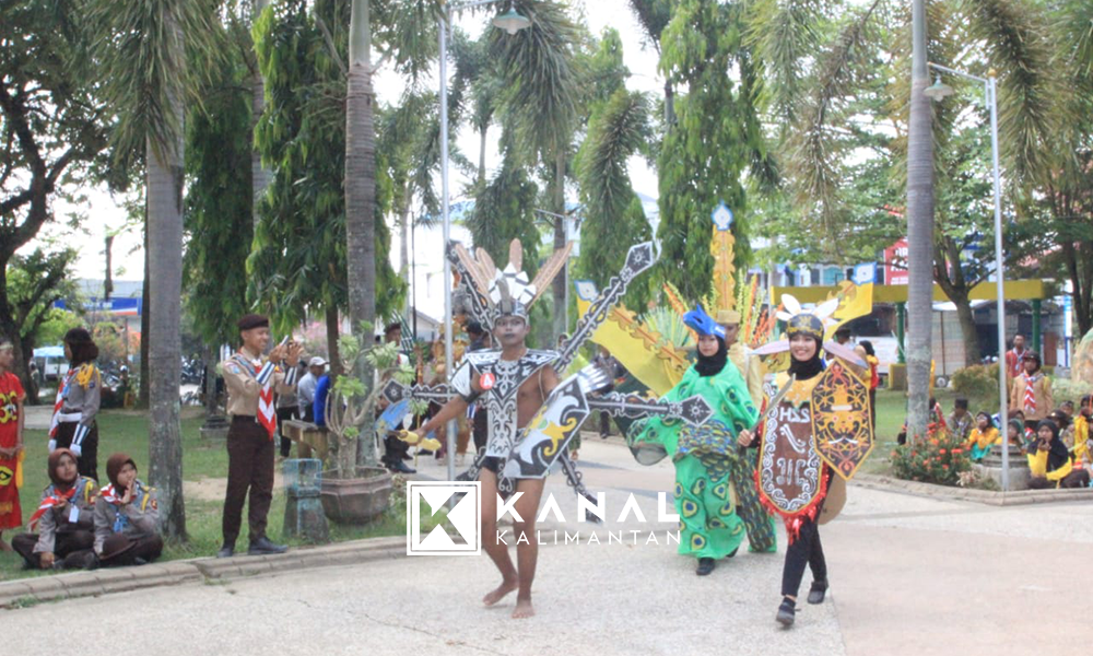 AMUNTAI, Lomba karnaval budaya kultur Borneo dilakukan peserta Perkemahan Bhakti Satuan Karya Bhayangkara Tingkat Daerah (Pertikrada) Kalsel tahun 2018.