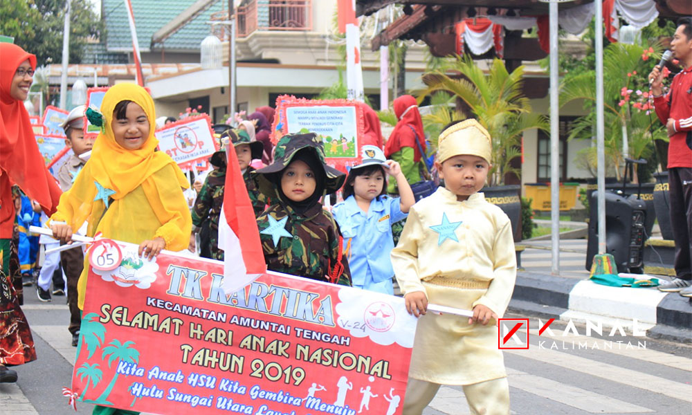 AMUNTAI, Menggunakan berbagai kostum profesi menarik, anak-anak dari TK/PAUD di Kabupaten Hulu Sungai Utara (HSU) mengikuti karnaval Hari Anak Nasional, Selasa (20/8).