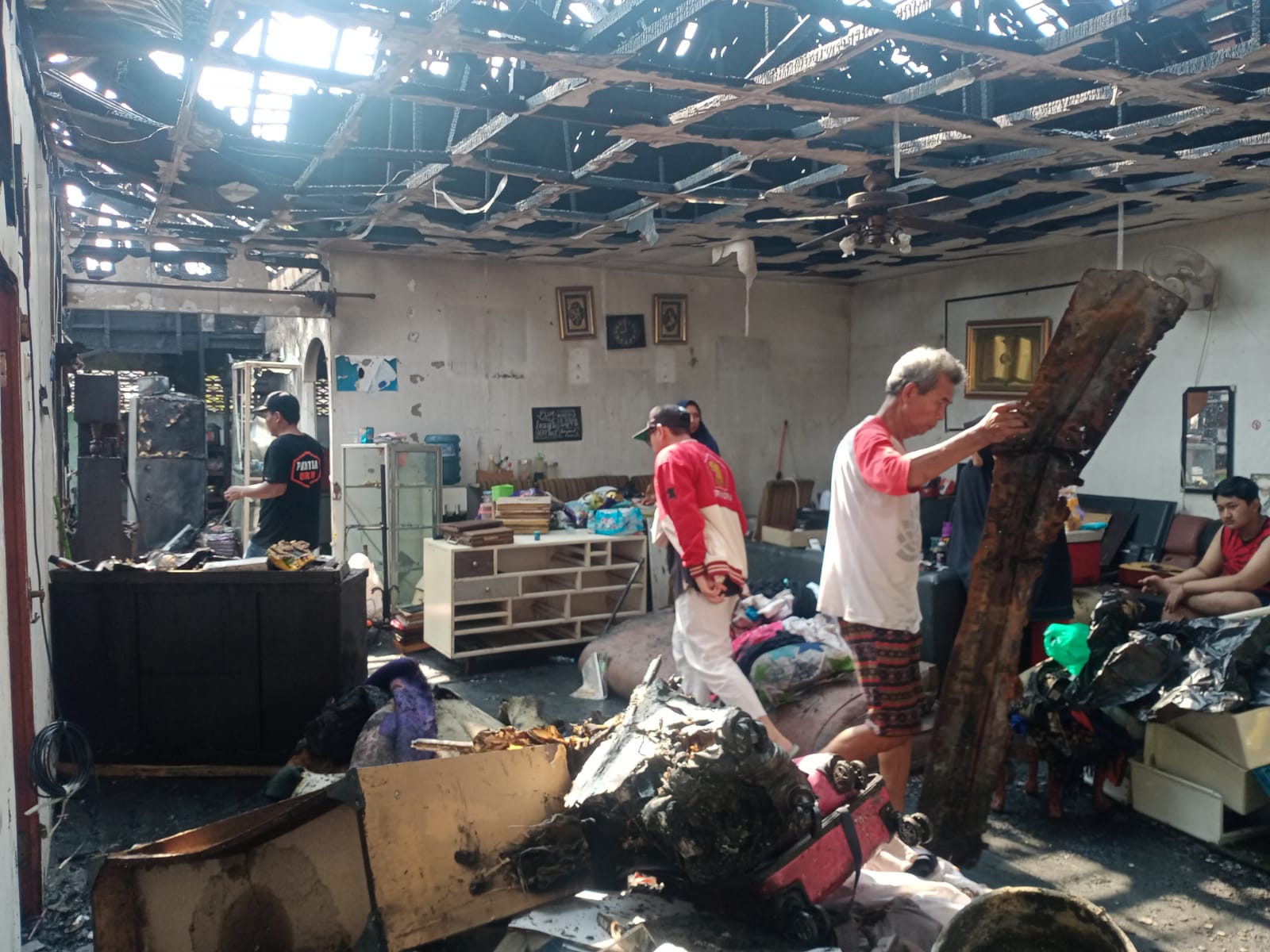 Nampak beberapa orang sedang sibuk mengumpulkan barang-barang sisa kebakaran yang masih bisa diselamatkan.