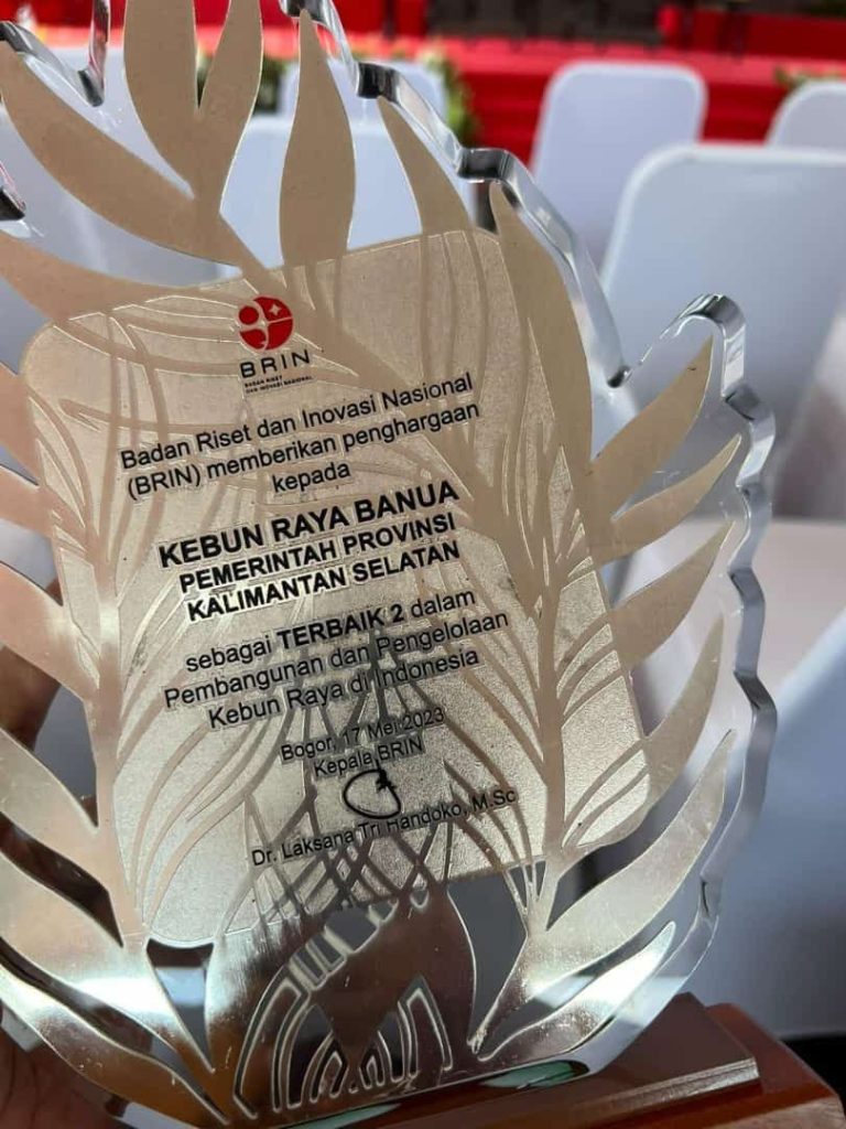 Diserahkan langsung Ketua Dewan Pengarah BRIN Megawati Sukarnoputri yang diterima Kepala UPTD Kebun Raya Banua Adilla Redha Yanti. Tampak hadir juga dalam penyerahan penghargaan Kepala Badan Riset dan Inovasi Daerah (Brida) Pemprov Kalsel Muhammad Amin.