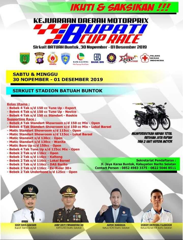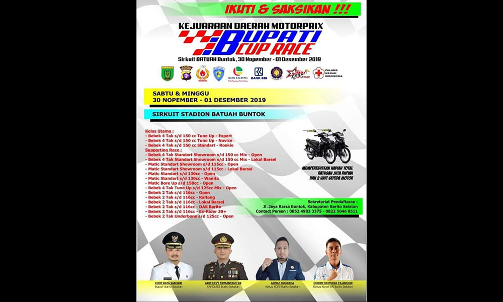 Ketua Panitia Pelaksana Eddy Purwanto menjelaskan, jadwal Bupati Cup Race 2019 telah dirilis dan akan digelar pasa Sabtu ini di sirkuit Batuah Buntok.