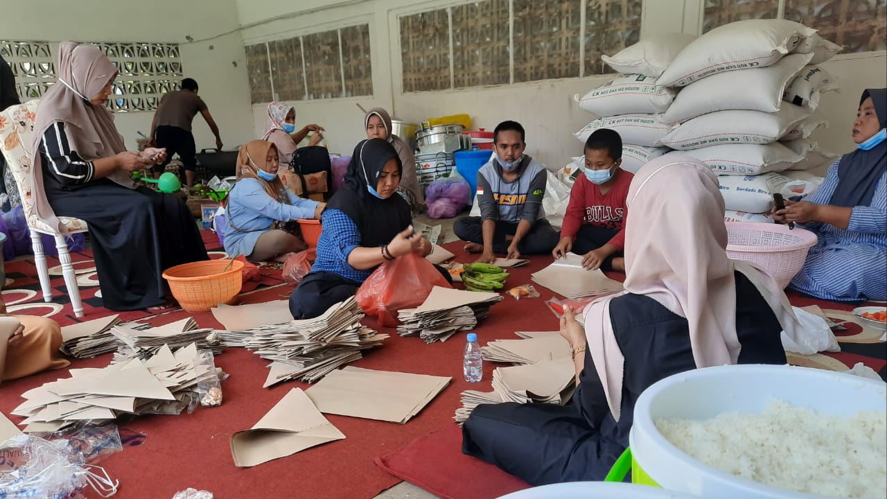 Puluhan relawan bahu membahu memasak nasi, lauk dan yang lainnya. H Mansyur dan istri juga turut sibuk menyiapkan makanan.