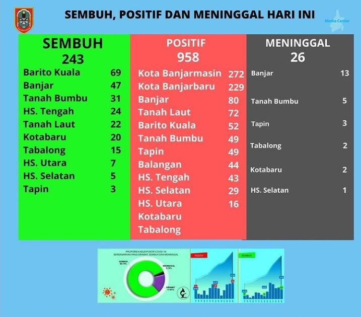 Kabar baiknya, diinformasikan sementara ada pasien yang sembuh sejumlah 243 orang. Barito Kuala 69 orang, Kab Banjar 47 orang, Tanah Bumbu 31 orang, Hulu Sungai Tengah 34 orang, Tanah Laut 22 orang, Kotabaru 20 orang, Tabalong 15 orang, Hulu Sungai Utara7 orang, Hulu Sungai Selatan 5 orang, dan Tapin 3 orang.