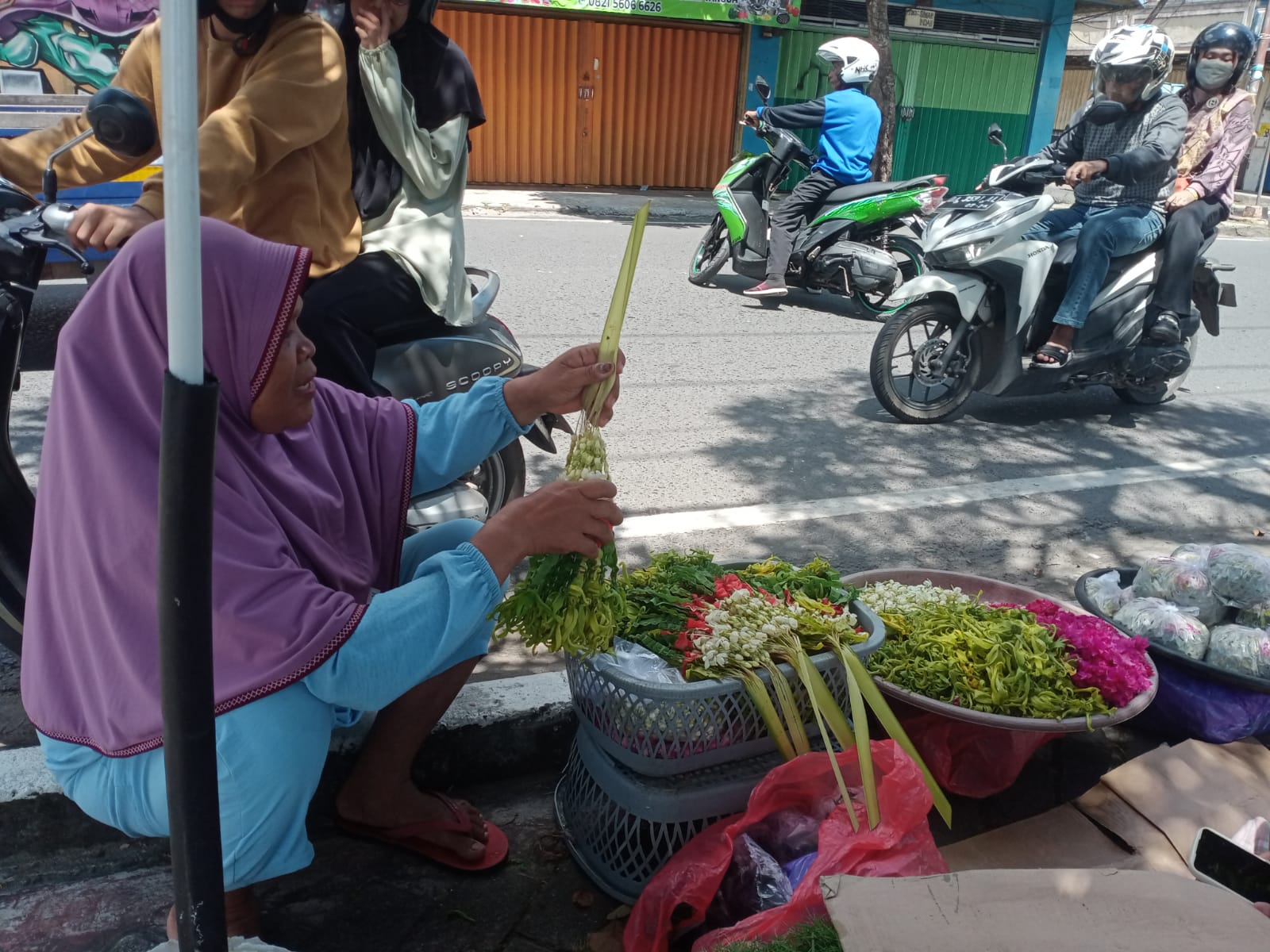 Jenis kembang yang dijual pun berbagai macam, mulai dari melati, kembang kenanga, kembang tunjuk hingga daun pandan yang dicampur dalam satu wadah atau dibuat berenteng.
