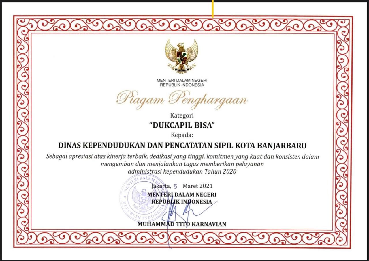 KANALKALIMANTAN.COM, BANJARBARU – Kementerian Dalam Negeri memberi penghargaan Dinas Kependudukan dan Catatan Sipil Kota Banjarbaru dengan kategori Dukcapil Bisa pada tanggal 5 Maret 2021.