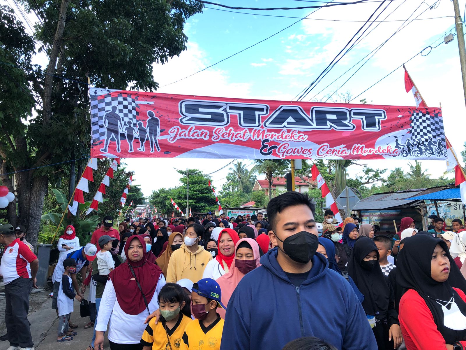Mulai dari orangtua hingga anak-anak ikut jalan sehat yang diadakan di kantor Kelurahan Guntung Payung.