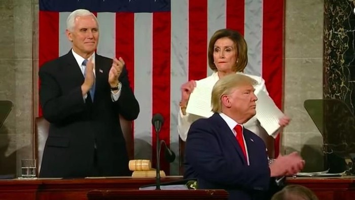 Seperti diberitakan AFP, Rabu (5/2/2020), saat Trump berpidato mengungkapkan berbagai pencapaiannya selama ini, Pelosi terlihat tersenyum sinis. Ketika Trump selesai berpidato, Pelosi pun berdiri dan merobek salinan naskah pidato Trump. Saat itu Pelosi berdiri di samping Wakil Presiden AS Mike Pence yang bertepuk tangan usai pidato Trump.