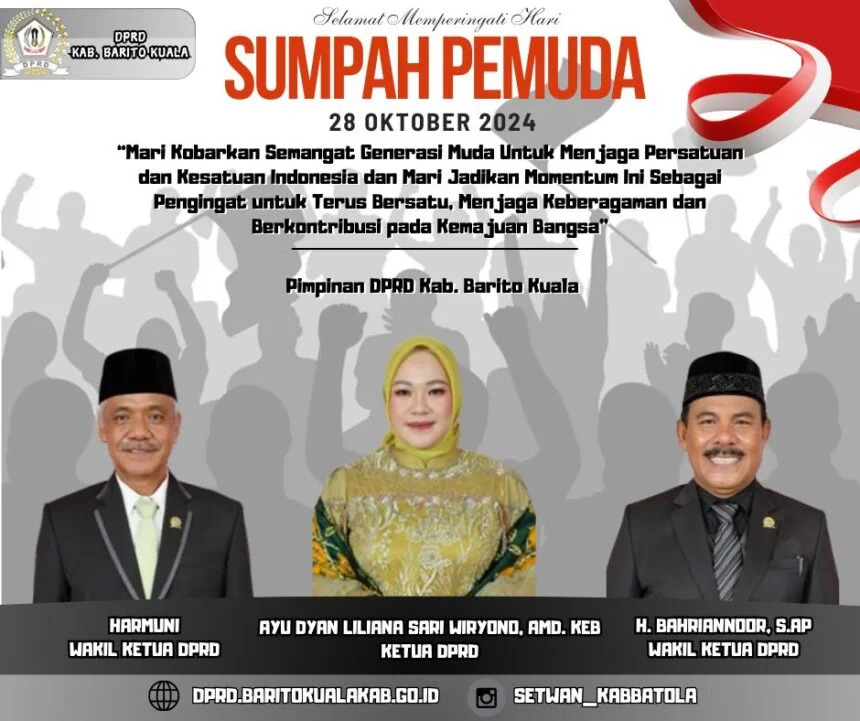 Ketua Dewan Perwakilan Rakyat Daerah (DPRD) Kabupaten Batola, Ayu Dyan, menyatakan sambutannya terhadap peringatan Hari Sumpah Pemuda 2024. Dalam kesempatan tersebut, Ayu Dyan menyampaikan ucapan selamat memperingati Hari Sumpah Pemuda, yang tidak hanya sekadar menjadi ajang perayaan, tetapi juga sebagai momen untuk merefleksikan semangat persatuan yang telah diwariskan oleh para pemuda pada tahun 1928.