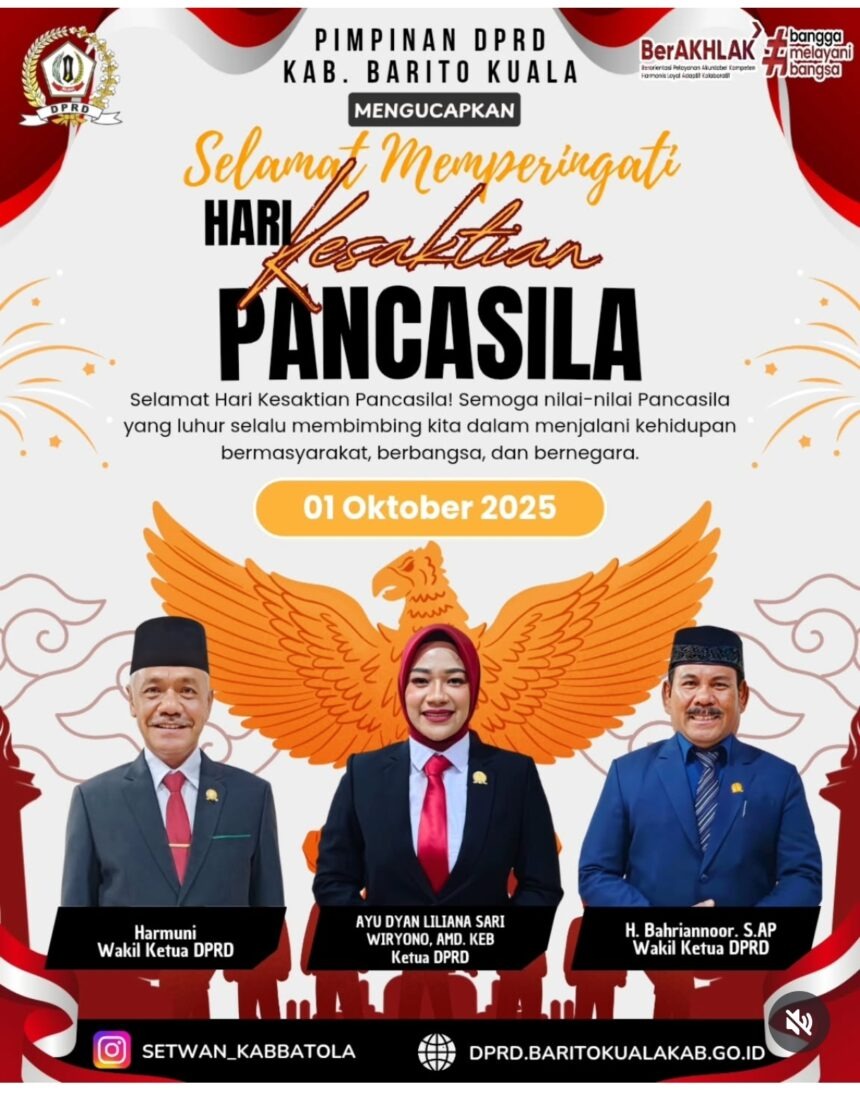 “Selamat Hari Kesaktian Pancasila! Semoga nilai-nilai luhur Pancasila selalu membimbing kita dalam menjalani kehidupan bermasyarakat, berbangsa, dan bernegara,” tutur Ketua DPRD Barito Kuala.